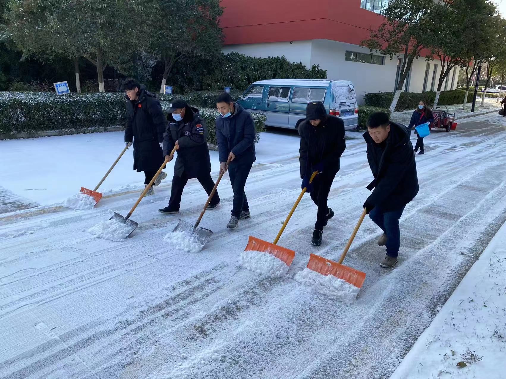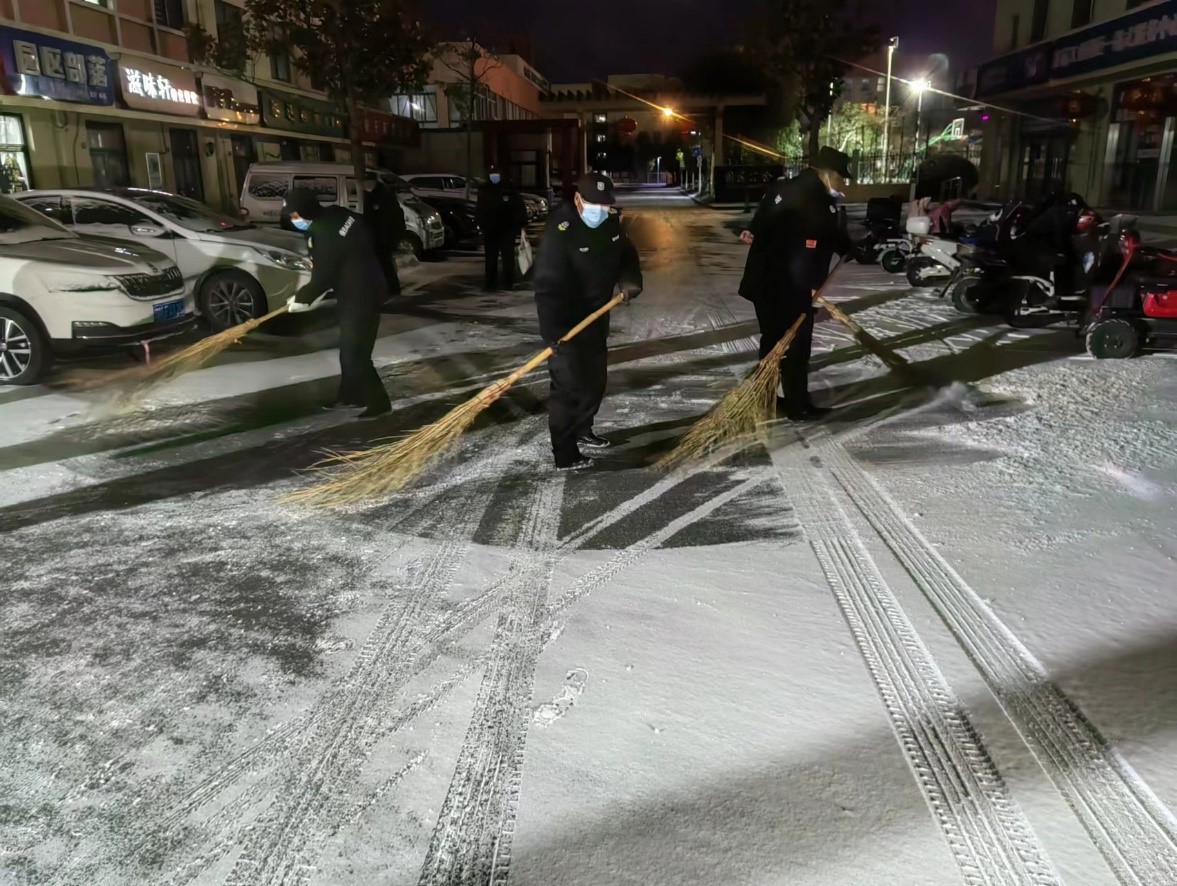 由于夜間雪情,道路積雪結(jié)冰,14日夜間,公司啟動應(yīng)急預(yù)案,調(diào)集現(xiàn)場人員,利用掃把、鐵鍬針對各道口、坡道及主要行人路段開展作業(yè),確保各項(xiàng)目道路通行順暢。