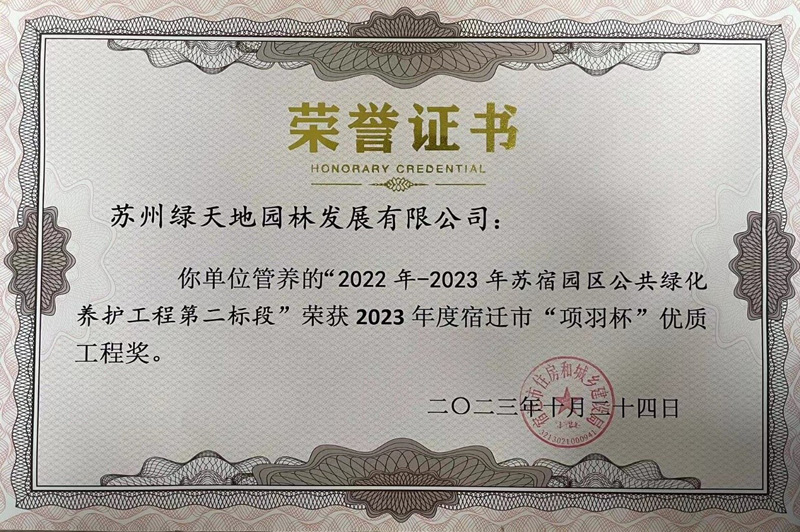 好消息!蘇宿園區(qū)公共綠化養(yǎng)護(hù)工程一、二標(biāo)段同時(shí)榮獲2023年“項(xiàng)羽杯”優(yōu)質(zhì)工程獎(jiǎng)