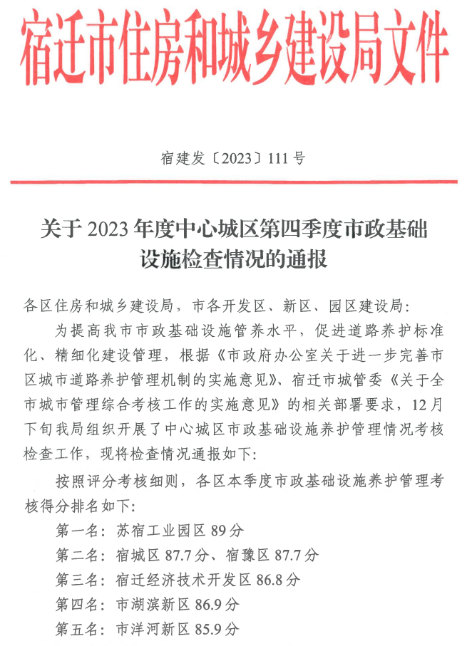 近日,宿遷市住房和城鄉(xiāng)建設(shè)局通報(bào)2023年中心城區(qū)第四季度市政基礎(chǔ)設(shè)施考核檢查情況,園區(qū)以89分的成績(jī)喜獲全市第一名。