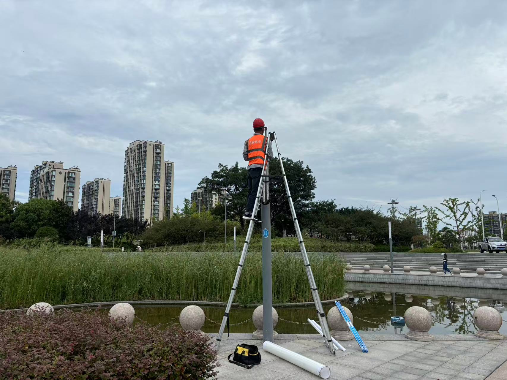 沈剛強(qiáng)介紹:“昨晚巡視發(fā)現(xiàn)蘇州公園大舞臺(tái)頂棚部分燈具因高溫?fù)p壞,今天一早我們立即組織維修,確保不影響居民晚上鍛煉。”