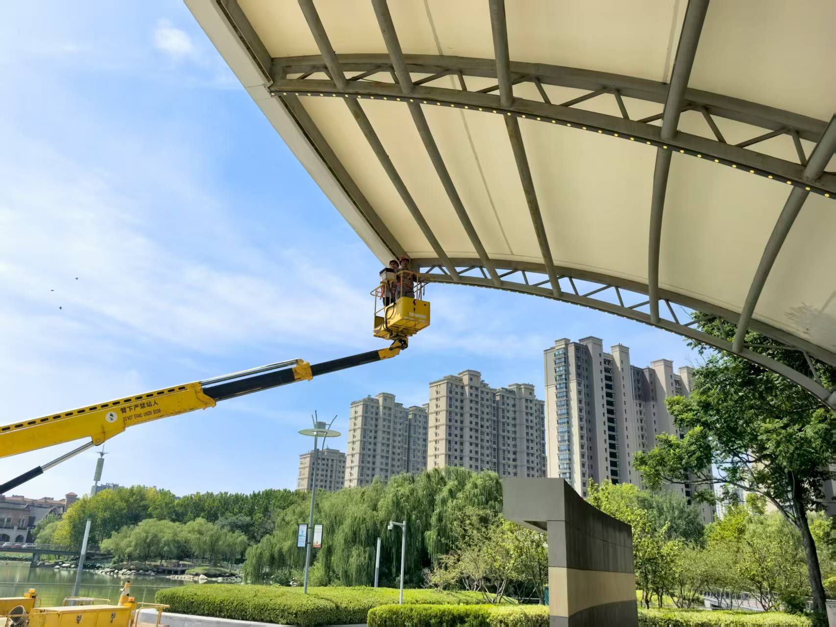 “今天在蘇州公園大舞臺(tái)進(jìn)行登高作業(yè),維修頂部燈光。注意作業(yè)平臺(tái)與頂棚保持安全距離……”8月20日上午9點(diǎn),夏日驕陽(yáng)似火,蘇州公園作業(yè)現(xiàn)場(chǎng)氣溫已接近37℃。園區(qū)機(jī)電維護(hù)項(xiàng)目部技術(shù)負(fù)責(zé)人沈剛強(qiáng)和同事們開始了當(dāng)天的第一場(chǎng)高空維修。