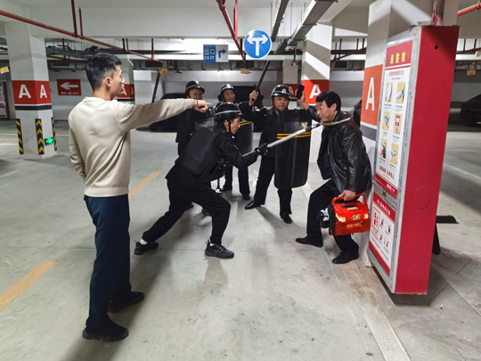 與此同時(shí),應(yīng)急處置崗隊(duì)員也攜帶防暴盾牌、橡膠棍等專業(yè)器械火速集結(jié),以最快速度抵達(dá)地下車庫指定區(qū)域。面對負(fù)隅頑抗的 “盜竊分子”,隊(duì)員們沉著冷靜,憑借日常訓(xùn)練形成的默契配合,迅速結(jié)成戰(zhàn)術(shù)小組,從不同方向?qū)?“盜竊分子” 實(shí)施包圍,果斷出擊、動(dòng)作規(guī)范,僅用數(shù)分鐘便成功將其治服,并移送公安機(jī)關(guān)處理。