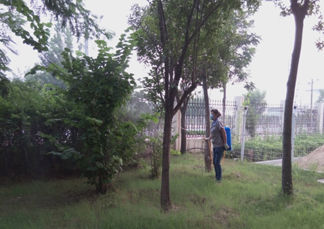 立秋以來天氣晴朗少雨,物業(yè)管理部按照園區(qū)公舍綠化養(yǎng)護(hù)計劃積極開展病蟲害防治工作,組織養(yǎng)護(hù)人員在人員流動性較少的時間段對園區(qū)公舍的花灌木、球類、綠籬等噴灑氧化樂果、阿維高氯等園林農(nóng)藥,共用30瓶農(nóng)藥,有效控制了園區(qū)公舍綠化病蟲害的發(fā)生。